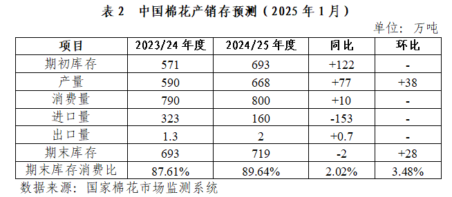 據(jù)國家棉花市場監(jiān)測系統(tǒng)1月數(shù)據(jù),2024/25年度國內(nèi)棉花產(chǎn)量667.6萬噸,同比增加77.3萬噸,環(huán)比調(diào)增37.6萬噸,處于近5個年度第2高點(2022/23年度的671.9萬噸為近5個年度最高紀(jì)錄);棉花消費量為800.0萬噸,同比增加10.0萬噸,環(huán)比持平;產(chǎn)需缺口由上年度的199.7萬噸縮小至132.4萬噸。