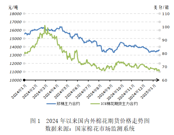 1月,美國經(jīng)濟(jì)數(shù)據(jù)顯示復(fù)蘇勢頭仍較強(qiáng)勁,通脹水平有所回升,美聯(lián)儲降息預(yù)期繼續(xù)降溫,美元指數(shù)保持強(qiáng)勢,大宗商品價格承壓;北半球棉花上市進(jìn)入尾聲,南半球棉花豐產(chǎn)預(yù)期增強(qiáng),美國農(nóng)業(yè)部最新的產(chǎn)需報告中大幅調(diào)增全球棉花產(chǎn)量,國際棉價進(jìn)一步走低,1月中旬ICE期棉跌破2024年9月美聯(lián)儲降息前的水平。國內(nèi)消費市場不溫不火,年末紡織廠補(bǔ)庫較謹(jǐn)慎,基本面對棉價支撐有限;最新數(shù)據(jù)顯示2024年國內(nèi)GDP增速完成年初5%的預(yù)定目標(biāo),穩(wěn)定市場預(yù)期,提振市場信心,宏觀情緒回暖是推動國內(nèi)棉花價格上漲的主要因素。截至1月23日,ICE棉花期貨主力合約結(jié)算價67.47美分/磅,較上月末下跌0.93美分/磅,跌幅1.36%;代表進(jìn)口棉中國主港到岸均價的國際棉花指數(shù)(M)76.80美分/磅,折人民幣進(jìn)口成本13398元/噸(1%關(guān)稅,不含港雜費),較上月末下跌202元/噸,跌幅1.49%。鄭州商品交易所棉花期貨主力合約結(jié)算價13515元/噸,較上月末上漲10元/噸,漲幅0.07%;代表內(nèi)地標(biāo)準(zhǔn)級皮棉市場價格的國家棉花價格B指數(shù)14650元/噸,較上月末上漲4元/噸,漲幅0.03%。