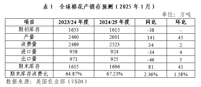 據(jù)美國農(nóng)業(yè)部1月預(yù)測,2024/25年度全球棉花產(chǎn)量2601萬噸,同比增加141萬噸,環(huán)比調(diào)增45萬噸;全球棉花消費量2523萬噸,同比增加34萬噸,環(huán)比調(diào)增2萬噸;產(chǎn)大于需77萬噸,環(huán)比擴(kuò)大43萬噸;全球棉花庫存消費比為67.23%,較上年度上升2.36個百分點。