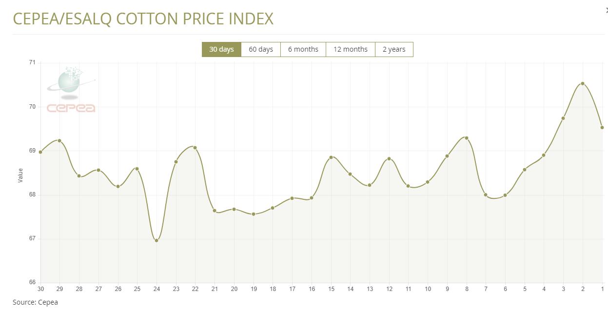 據(jù)外電1月24日消息,1月24日巴西CEPEA/ESALQ棉花價(jià)格指數(shù)報(bào)69.53美分/磅,較前一交易日下跌1.42%。
