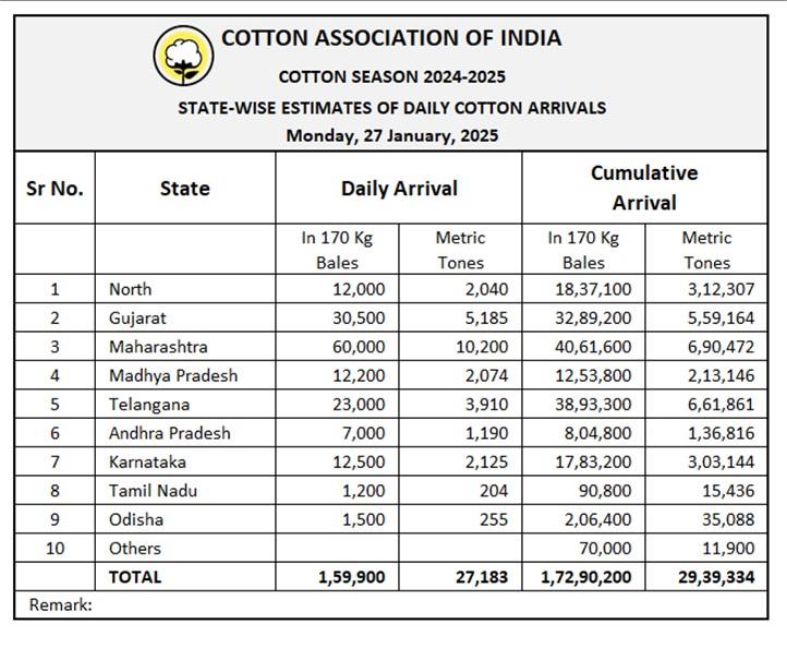 據外電1月27日消息,印度棉花協會(CAI)公布,2025年1月27日印度棉花到貨量預估為159900包(每包170公斤)或27183噸。