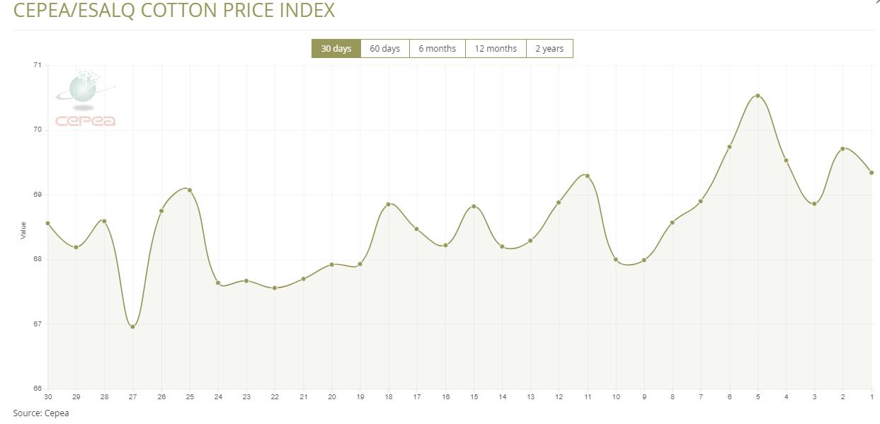 據(jù)外電1月29日消息,1月29日巴西CEPEA/ESALQ棉花價格指數(shù)報69.34美分/磅,較前一交易日下滑0.53%。