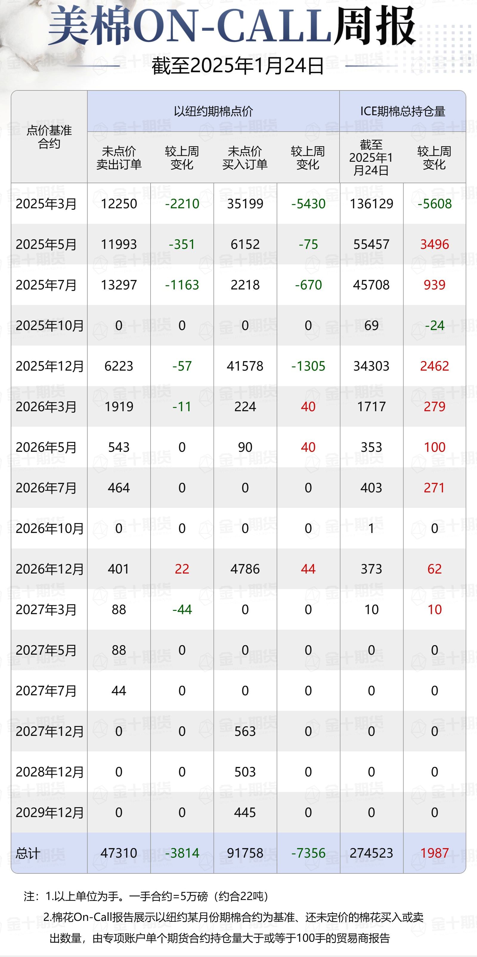 據(jù)美國商品期貨交易委員會(huì)(CFTC)最新數(shù)據(jù),截至1月24日,①美棉On-Call未點(diǎn)價(jià)賣出訂單47310手,環(huán)比減少3814手;未點(diǎn)價(jià)買入訂單91758手,環(huán)比減少7356手;②ICE期棉2503合約上賣方未點(diǎn)價(jià)合約為12250手,環(huán)比減少2210手;③ICE期棉2505合約上賣方未點(diǎn)價(jià)合約為11993手,環(huán)比減少351手;④ICE期棉2507合約上賣方未點(diǎn)價(jià)合約為13297手,環(huán)比減少1163手;⑤ICE棉花期貨盤面2024/25年度(8月至次年7月)的On-Call合約未點(diǎn)價(jià)賣出訂單為37540手,環(huán)比減少3724手。