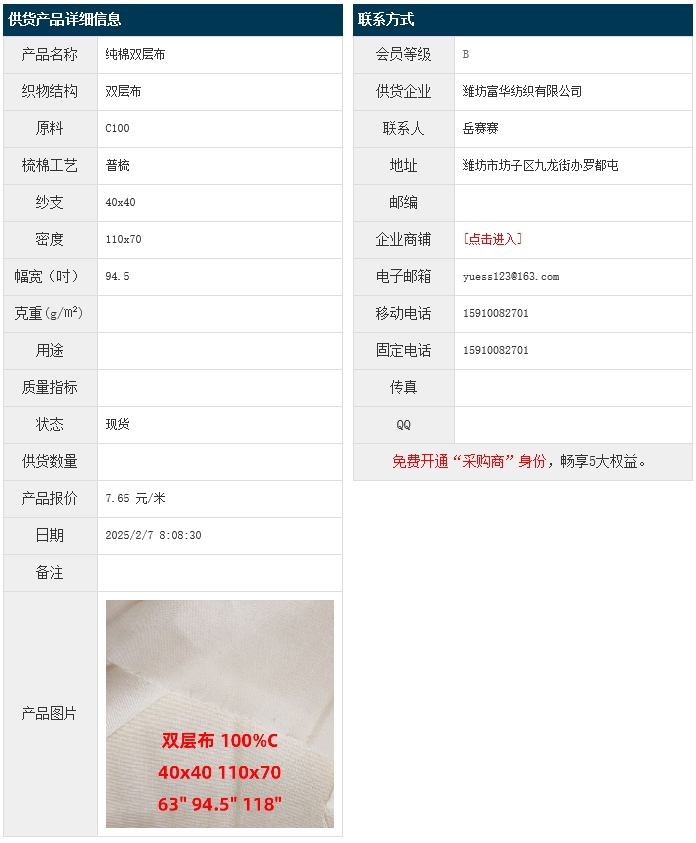 2月7日,濰坊富華紡織有限公司純棉雙層布C100 40x40 110x70 94.5",報(bào)價(jià)為7.65元/米,實(shí)際成交價(jià)以協(xié)商為準(zhǔn)。[點(diǎn)擊查看詳情]