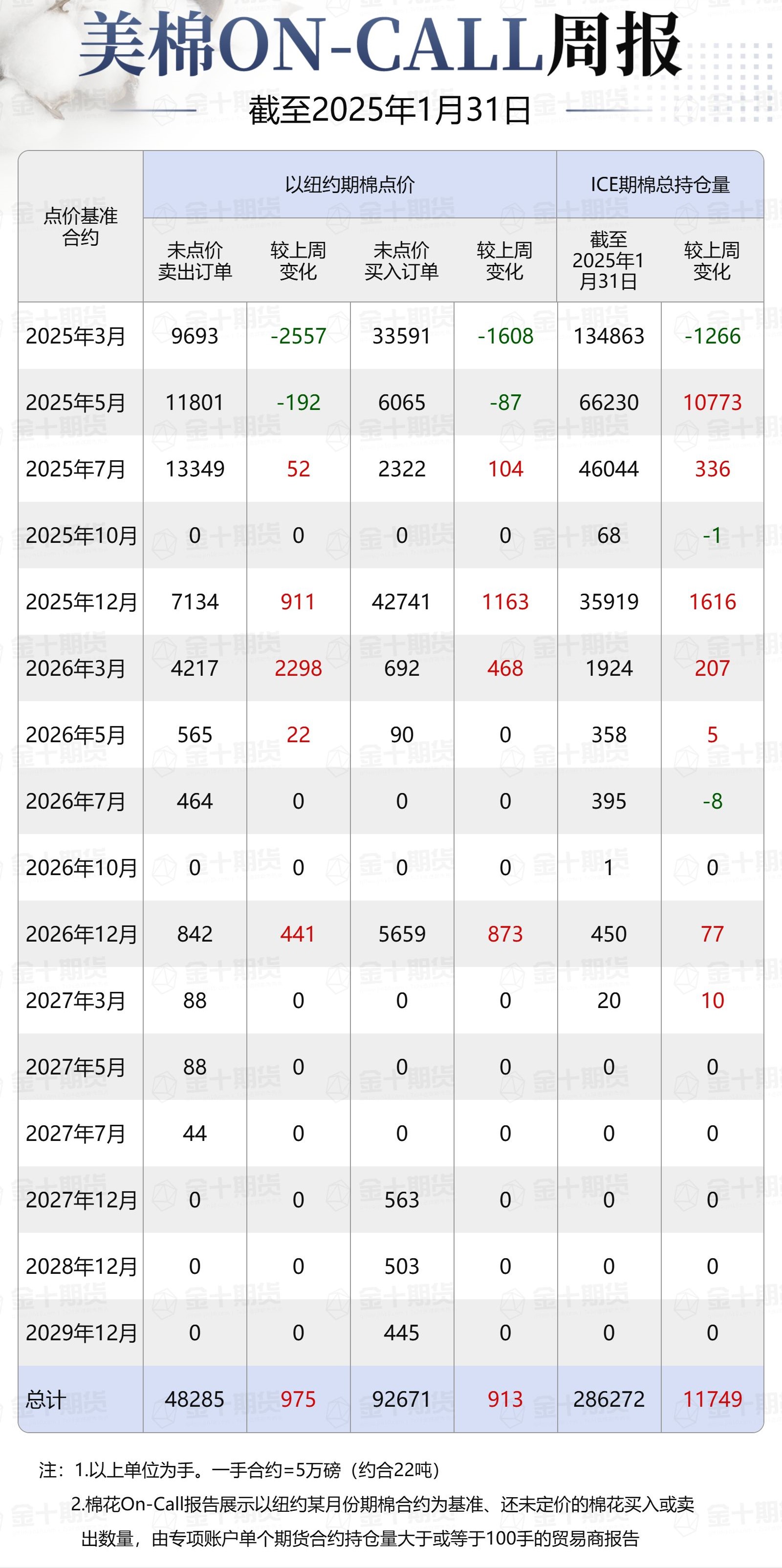 據(jù)美國商品期貨交易委員會(CFTC)最新數(shù)據(jù),截至1月31日,①美棉On-Call未點價賣出訂單48285手,環(huán)比增加975手;未點價買入訂單92671手,環(huán)比增加913手;②ICE期棉2503合約上賣方未點價合約為9693手,環(huán)比減少2557手;③ICE期棉2505合約上賣方未點價合約為11801手,環(huán)比減少192手;④ICE期棉2507合約上賣方未點價合約為13349手,環(huán)比增加52手;⑤ICE棉花期貨盤面2024/25年度(8月至次年7月)的On-Call合約未點價賣出訂單為34843手,環(huán)比減少2697手。
