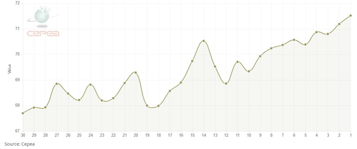 以下為近30日走勢(shì)圖:(單位:美分/磅)