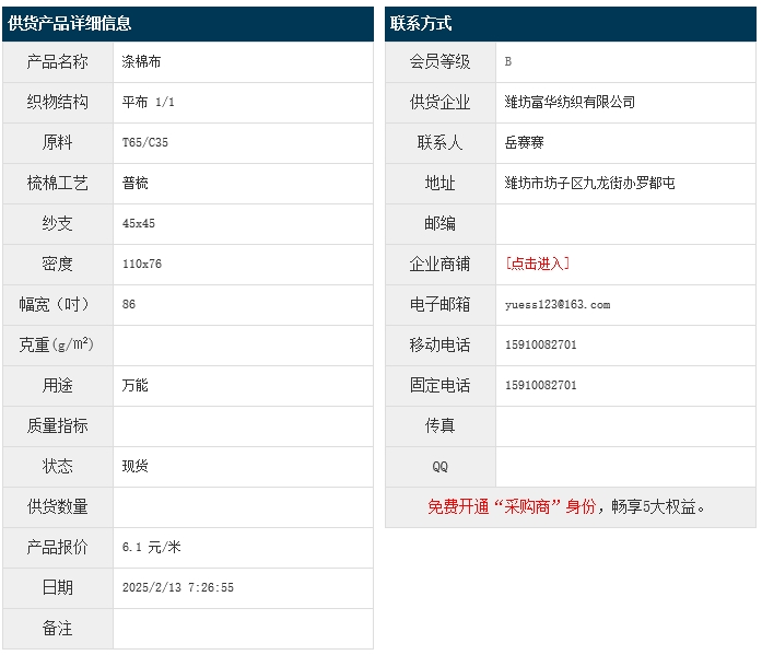 2月13日,濰坊富華紡織有限公司滌棉平布T65/C35 45x45 110x76 86" 1/1,報(bào)價(jià)為6.1元/米,實(shí)際成交價(jià)以協(xié)商為準(zhǔn)。[點(diǎn)擊查看詳情]