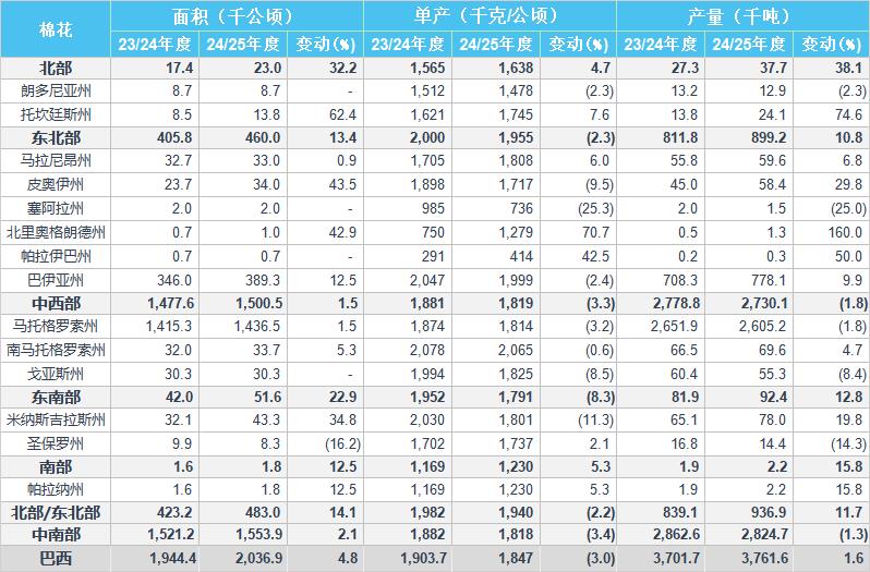 2024/25年度巴西棉花種植面積預估為203.69萬公頃,同比增加4.8%,2023/24年度為194.44萬公頃。