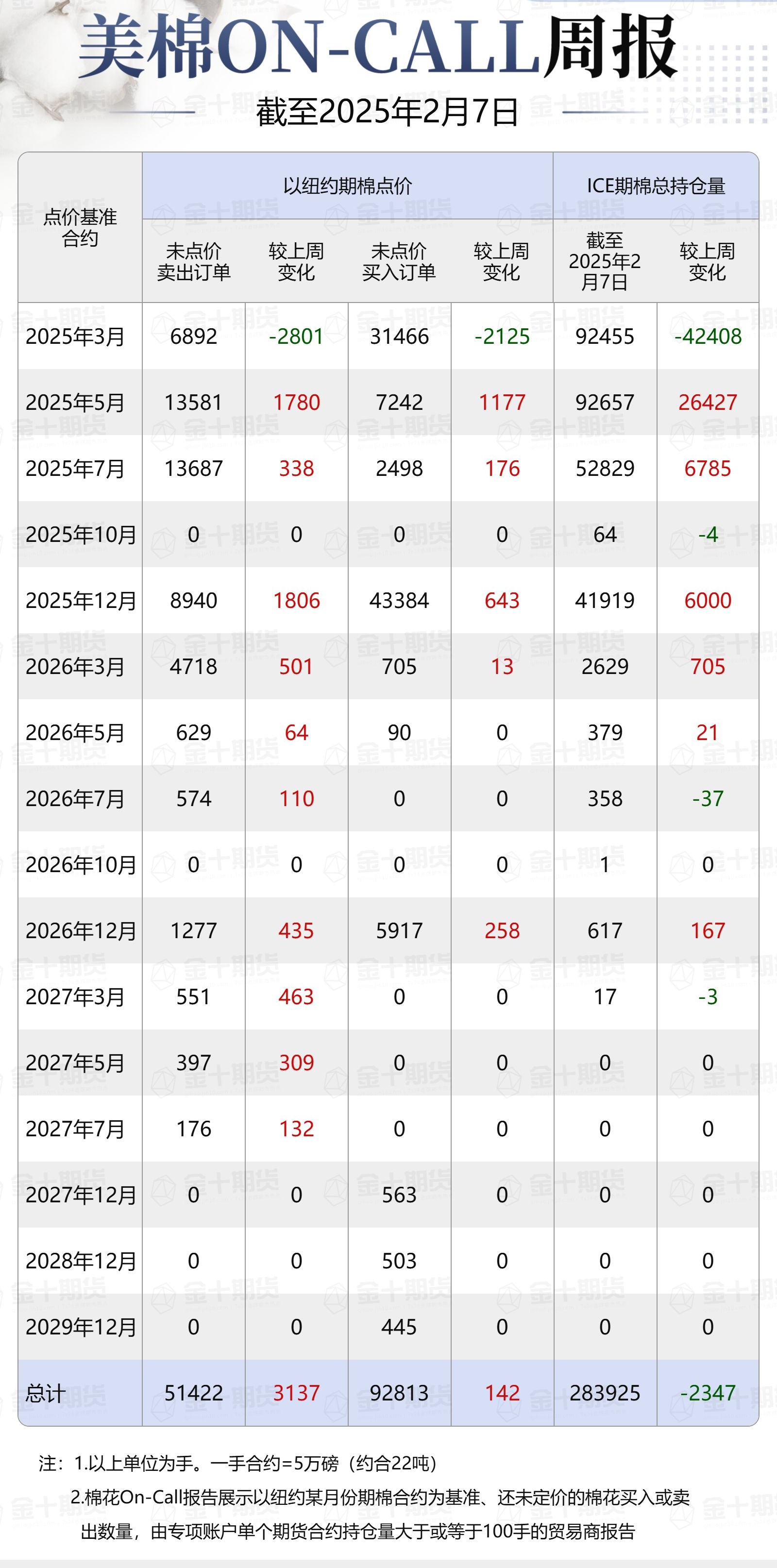 據(jù)美國商品期貨交易委員會(CFTC)最新數(shù)據(jù),截至2月7日,①美棉On-Call未點價賣出訂單51422手,環(huán)比增加3137手;未點價買入訂單92813手,環(huán)比增加142手;②ICE期棉2503合約上賣方未點價合約為6892手,環(huán)比減少2801手;③ICE期棉2505合約上賣方未點價合約為13581手,環(huán)比增加1780手;④ICE期棉2507合約上賣方未點價合約為13687手,環(huán)比增加338手;⑤ICE棉花期貨盤面2024/25年度(8月至次年7月)的On-Call合約未點價賣出訂單為34160手,環(huán)比減少683手。