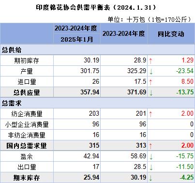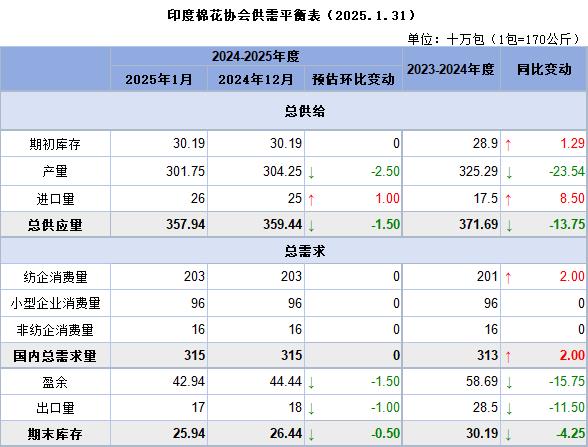 產(chǎn)量下降提升棉價(jià)看漲情緒。印度國內(nèi)消費(fèi)量預(yù)計(jì)為3150萬包,出口量預(yù)計(jì)將從上年度的283.6萬包降至170萬包,供應(yīng)限制可能會使價(jià)格居高不下。截至2025年1月31日,棉花總供應(yīng)量估計(jì)為2342.6萬包,其中包括1880.7萬包的新軋棉、160萬包進(jìn)口棉、301.9萬包的期初庫存。