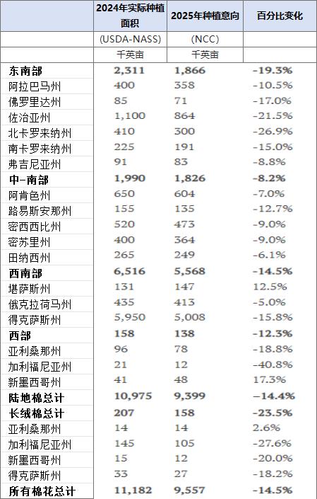 據(jù)外電2月16日消息,據(jù)美國(guó)國(guó)家棉花委員會(huì)(NationalCottonCouncil)第44次季初種植意向年度調(diào)查(AnnualEarlySeasonPlantingIntentionsSurvey),美國(guó)棉農(nóng)計(jì)劃今年春季種植960萬(wàn)英畝棉花,較2024年下降14.5%。
