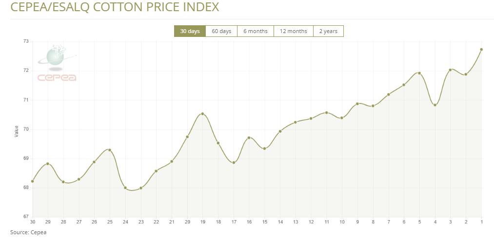 據(jù)外電2月18日消息,2月18日巴西CEPEA/ESALQ棉花價格指數(shù)報72.73美分/磅,較前一交易日上漲1.18%。