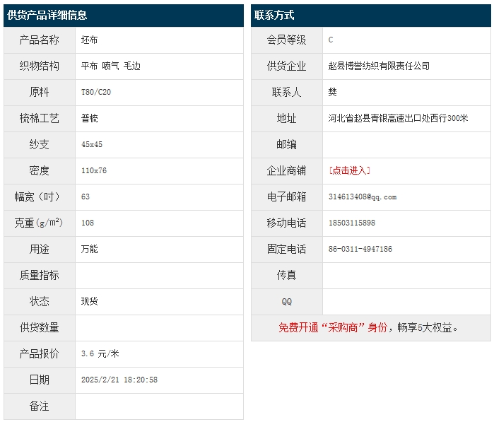 2月21日,趙縣博譽紡織有限責任公司滌棉平布T80/C20 45x45 110x76 63" 108g/㎡ 噴氣 毛邊,報價為3.6元/米,實際成交價以協(xié)商為準。[點擊查看詳情]