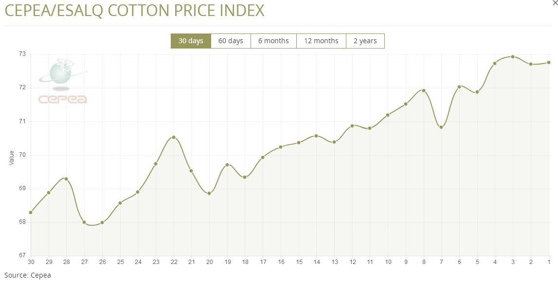 據外電2月21日消息,2月21日巴西CEPEA/ESALQ棉花價格指數報72.71美分/磅,較前一交易日下跌0.30%。