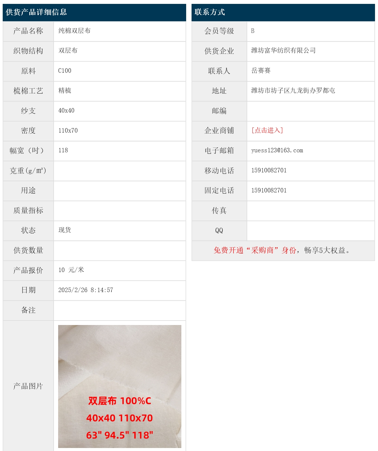 2月26日,濰坊富華紡織有限公司純棉雙層布JC100 40x40 110x70 118",報(bào)價(jià)為10元/米,實(shí)際成交價(jià)以協(xié)商為準(zhǔn)。[點(diǎn)擊查看詳情]