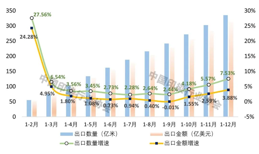 根據(jù)中國(guó)海關(guān)統(tǒng)計(jì)數(shù)據(jù),2024年1-12月,我國(guó)印染八大類產(chǎn)品出口數(shù)量335.34億米,同比增長(zhǎng)7.53%,增速較前3季度提高5.09個(gè)百分點(diǎn);出口金額312.95億美元,同比增長(zhǎng)3.88%,增速較前3季度提高3.89個(gè)百分點(diǎn);出口平均單價(jià)0.93美元/米,同比降低3.39%,降幅較前3季度擴(kuò)大1.00個(gè)百分點(diǎn)。4季度,隨著國(guó)外感恩節(jié)、圣誕節(jié)等重要節(jié)假日的到來,海外紡織服裝補(bǔ)庫(kù)存需求逐步釋放,國(guó)際市場(chǎng)對(duì)我國(guó)印染面料需求增加,同時(shí)受美國(guó)政府對(duì)中國(guó)出口產(chǎn)品潛在加征關(guān)稅的影響,我國(guó)紡織服裝企業(yè)積極調(diào)整外貿(mào)節(jié)奏,短期內(nèi)“搶出口”效應(yīng)進(jìn)一步推高印染產(chǎn)品出口增速。