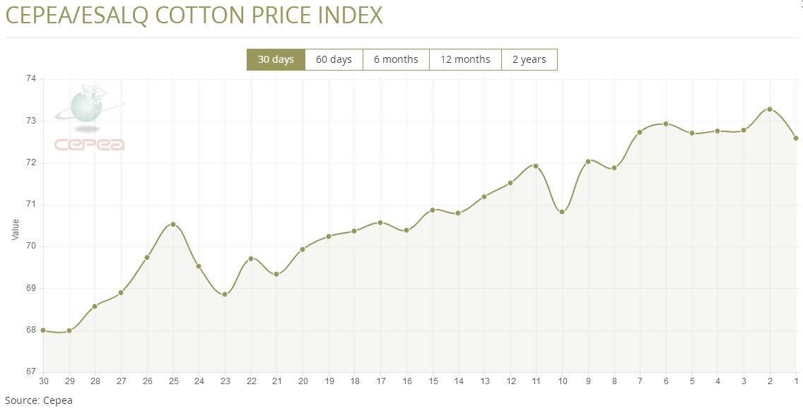 據(jù)外電2月26日消息,2月26日巴西CEPEA/ESALQ棉花價格指數(shù)報72.59美分/磅,較前一交易日下跌0.94%。