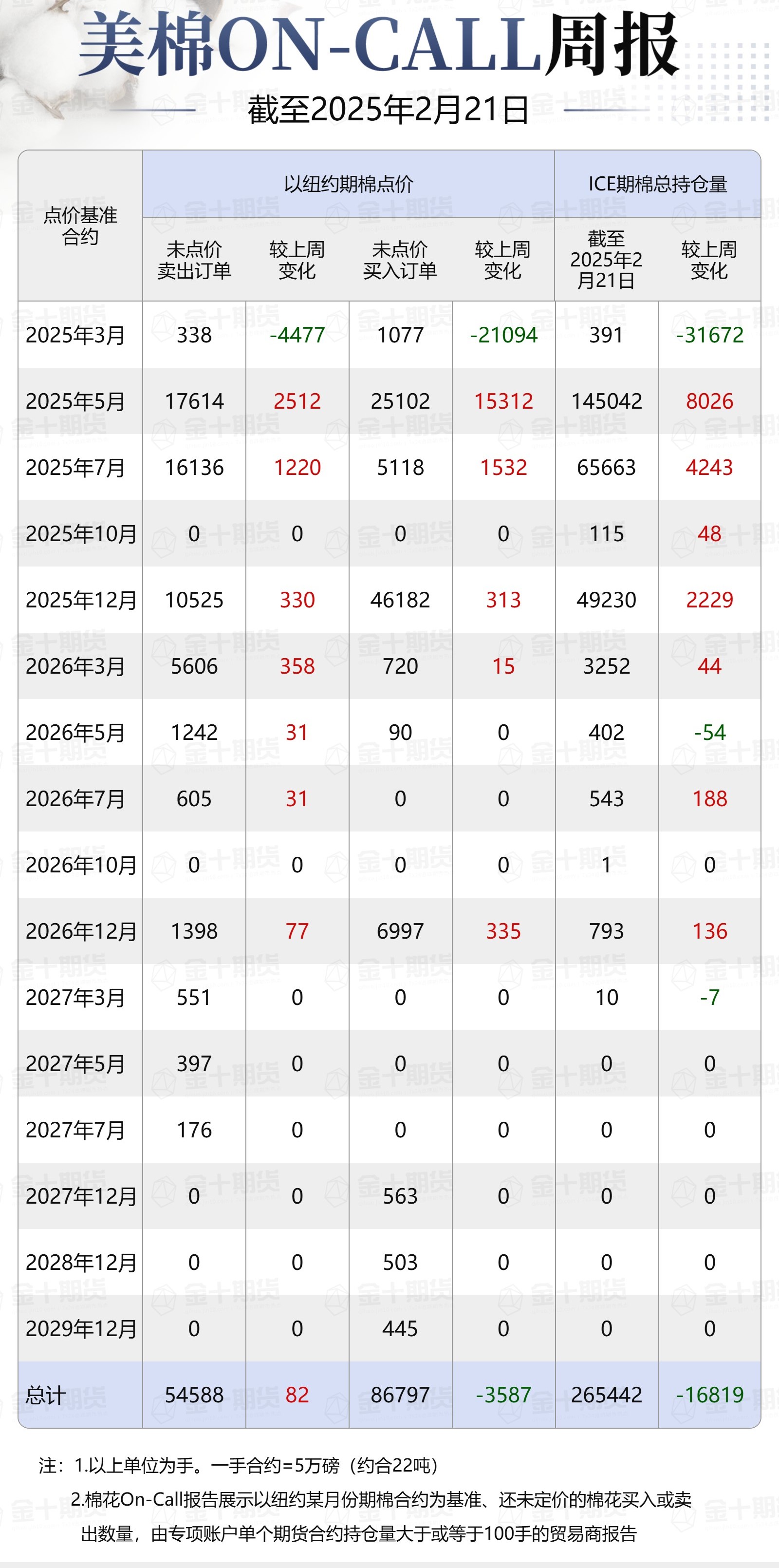 據(jù)美國商品期貨交易委員會(CFTC)最新數(shù)據(jù),截至2月21日,①美棉On-Call未點價賣出訂單54588手,環(huán)比增加82手;未點價買入訂單86797手,環(huán)比減少3587手;②ICE期棉2503合約上賣方未點價合約為338手,環(huán)比減少4477手;③ICE期棉2505合約上賣方未點價合約為17614手,環(huán)比增加2512手;④ICE期棉2507合約上賣方未點價合約為16136手,環(huán)比增加1220手;⑤ICE棉花期貨盤面2024/25年度(8月至次年7月)的On-Call合約未點價賣出訂單為34088手,環(huán)比減少745手。