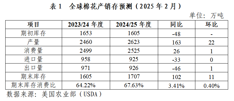 據美國農業(yè)部2月預測,2024/25年度全球棉花產量2623萬噸,同比增加163萬噸,環(huán)比繼續(xù)調增22萬噸;全球棉花消費量2525萬噸,同比增加26萬噸,環(huán)比調增1萬噸;全球棉花供需狀況進一步寬松,產大于需擴大至98萬噸,環(huán)比增加21萬噸;全球棉花庫存消費比為67.63%,較上年度上升3.41個百分點,環(huán)比上升0.40個百分點。