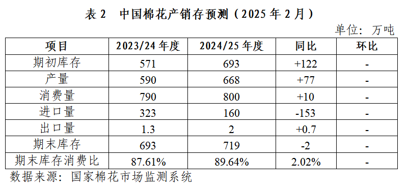 據國家棉花市場監(jiān)測系統(tǒng)2月數據,2024/25年度國內棉花產量668萬噸,同比增加77萬噸,環(huán)比持平,處近5個年度第2高點(2022/23年度的672萬噸為近5個年度最高紀錄);棉花消費量為800萬噸,同比增加10萬噸,環(huán)比持平;產需缺口由上年度的200萬噸縮小至132萬噸。