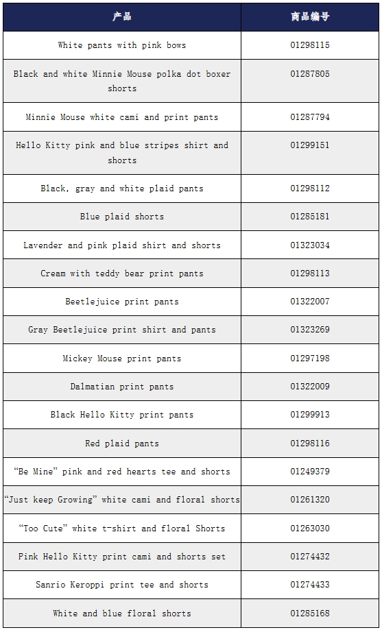 此次召回產(chǎn)品為Forever 21的20款兒童睡衣。產(chǎn)品尺寸為5/6、7/8、9/10、11/12、13/14,款式編號(hào)為01263030,UPC為0126303。具體召回產(chǎn)品信息如下: