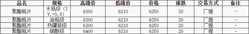 華東聚酯瓶片價格上漲20元至6250元/噸,原油及原料價格上行,聚酯瓶片市場重心隨之上揚。2-3月貨源報盤6210-6300元/噸,局部略高6350元/噸,或期貨合約05貼水10-50元/噸;遞盤6190-6240元/噸,下游買氣偏弱,交投僵持。
