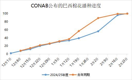 新年度美國在全球出口中的份額預(yù)期將略有增加,但巴西預(yù)計將連續(xù)第3年成為全球最大棉花出口國,巴西新作棉花播種完畢,作物進入生長關(guān)鍵期,關(guān)注巴西種植帶天氣情況。巴西農(nóng)業(yè)部下屬的國家商品供應(yīng)公司CONAB公布稱,截至2月23日,巴西棉花播種率為99.9%,上周為95.9%,去年同期為99.5%。