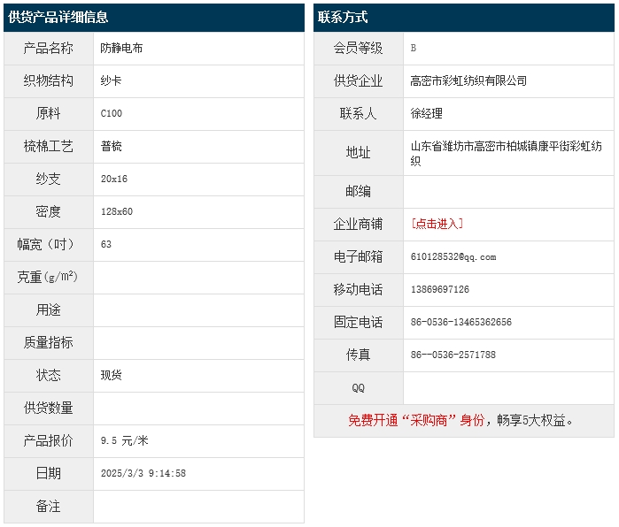 3月3日,高密彩虹紡織有限公司防靜電紗卡C100 20x16 128x60 63",報價為9.5元/米,實際成交價以協(xié)商為準。[點擊查看詳情]