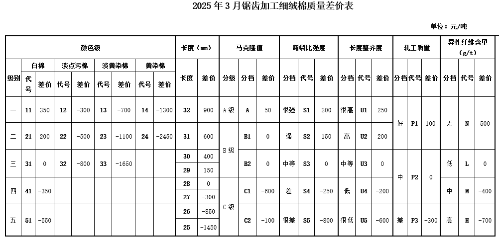 根據(jù)《中國棉花協(xié)會國產(chǎn)棉質(zhì)量差價表管理辦法》規(guī)定,現(xiàn)正式發(fā)布2025年3月《鋸齒加工細絨棉質(zhì)量差價表》、《皮輥加工細絨棉質(zhì)量差價表》、《長絨棉質(zhì)量差價表》(單位:元/噸)。