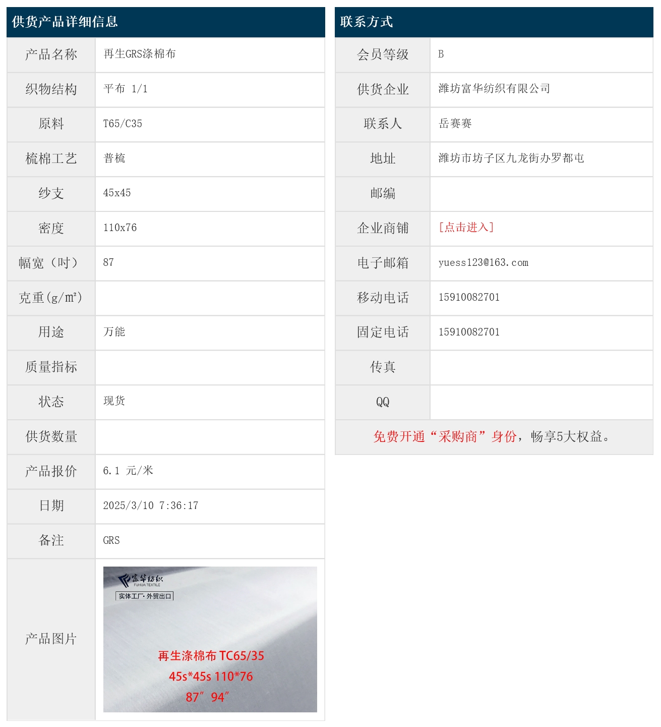 3月10日,濰坊富華紡織有限公司再生GRS滌棉平布T65/C35 45x45 110x76 87" 1/1,報價為6.1元/米,實際成交價以協(xié)商為準。[點擊查看詳情]