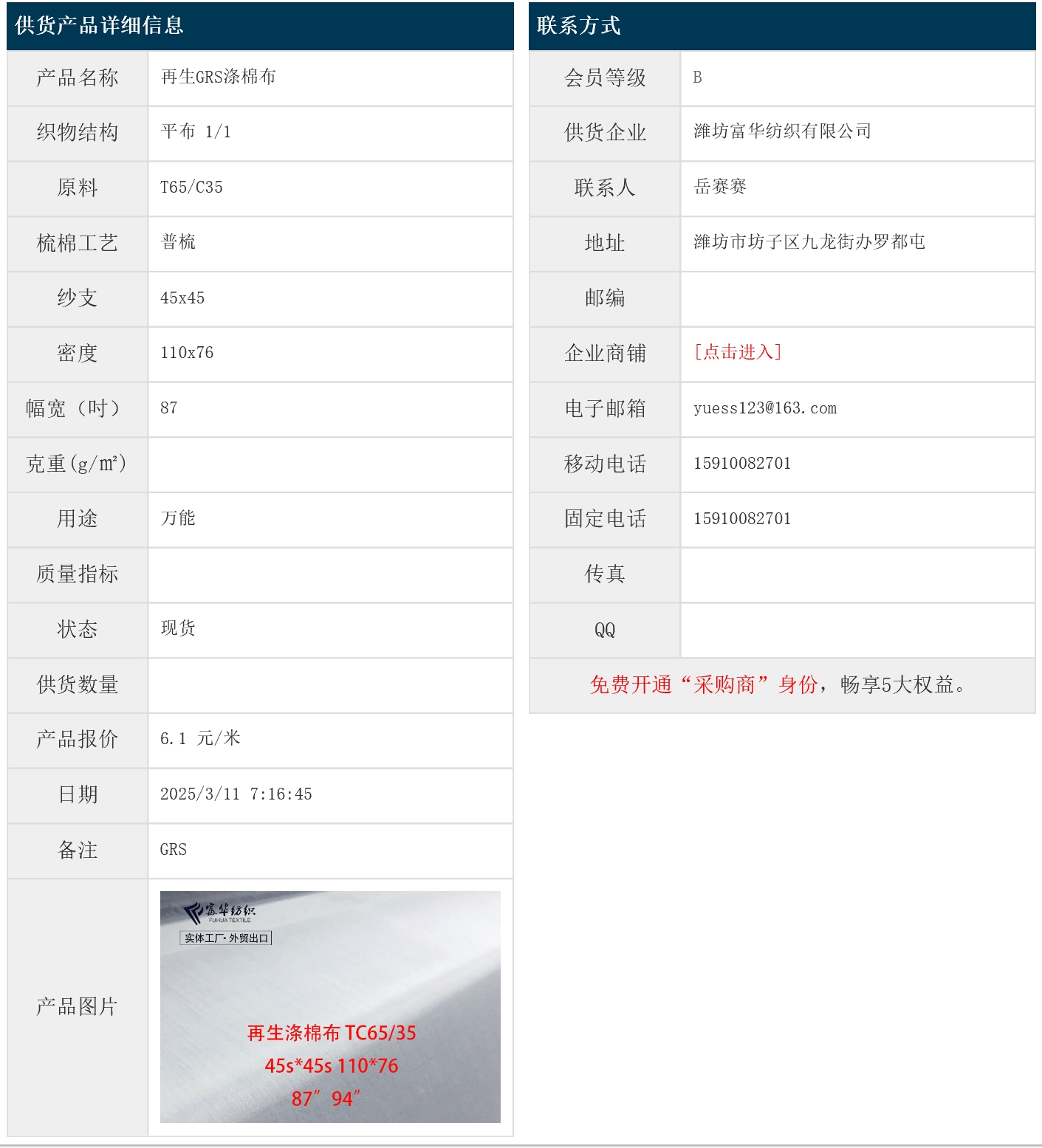 3月11日,濰坊富華紡織有限公司再生GRS滌棉平布T65/C35 45x45 110x76 87" 1/1,報價為6.1元/米,實際成交價以協(xié)商為準。[點擊查看詳情]