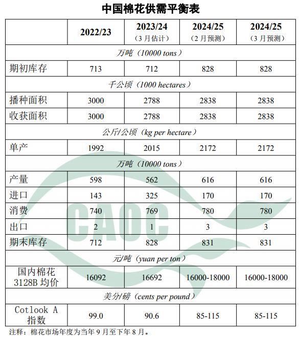 本月對(duì)2024/25年度中國(guó)棉花供需形勢(shì)預(yù)測(cè)不做調(diào)整。國(guó)內(nèi)市場(chǎng),棉花商業(yè)庫(kù)存仍處近5年同期最高位,供給較充裕。春節(jié)后紡織廠陸續(xù)復(fù)工,開機(jī)率逐步升至高位,紡織成品出庫(kù)有所加快。國(guó)際市場(chǎng),美國(guó)、巴西棉花出口較上年同期增加,紡織業(yè)市場(chǎng)前景謹(jǐn)慎樂(lè)觀。北半球新棉即將進(jìn)入播種期,后期需關(guān)注各主產(chǎn)國(guó)播種情況。