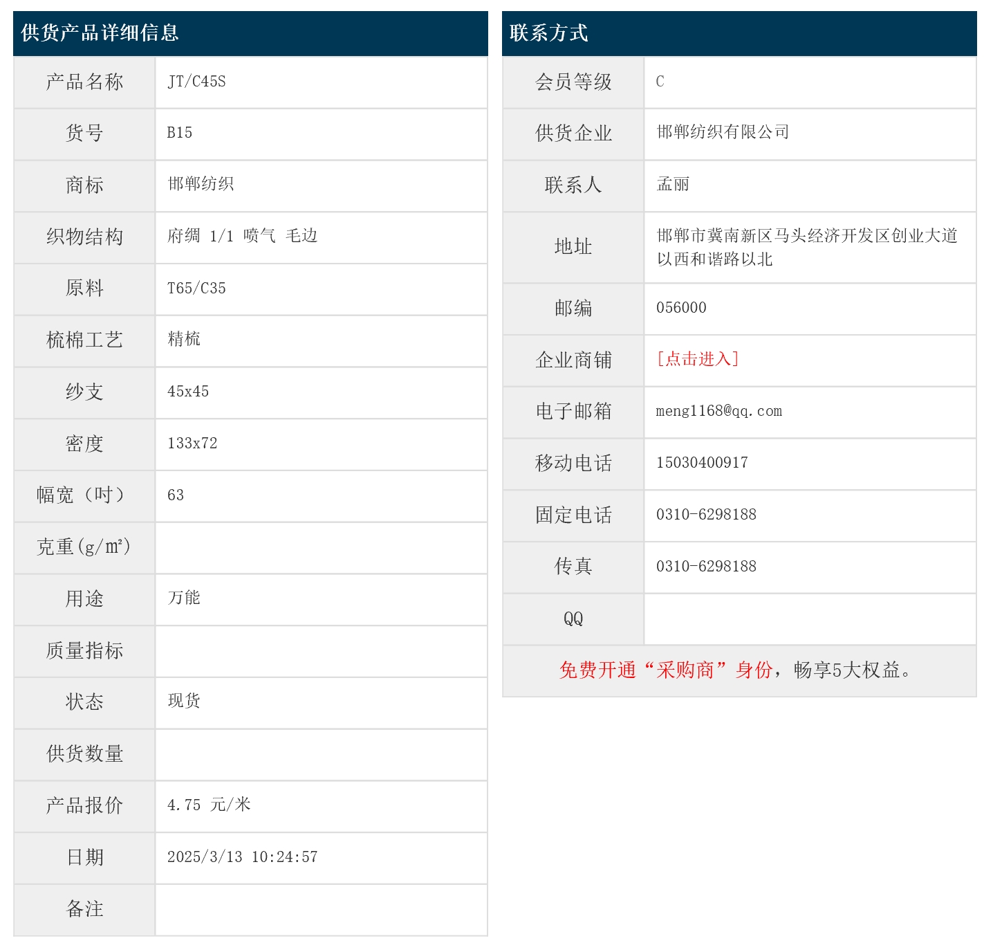3月13日,邯鄲紡織有限公司滌棉府綢T65/JC35 45x45 133x72 63" 1/1 噴氣 毛邊,報(bào)價(jià)為4.75元/米,實(shí)際成交價(jià)以協(xié)商為準(zhǔn)。[點(diǎn)擊查看詳情]