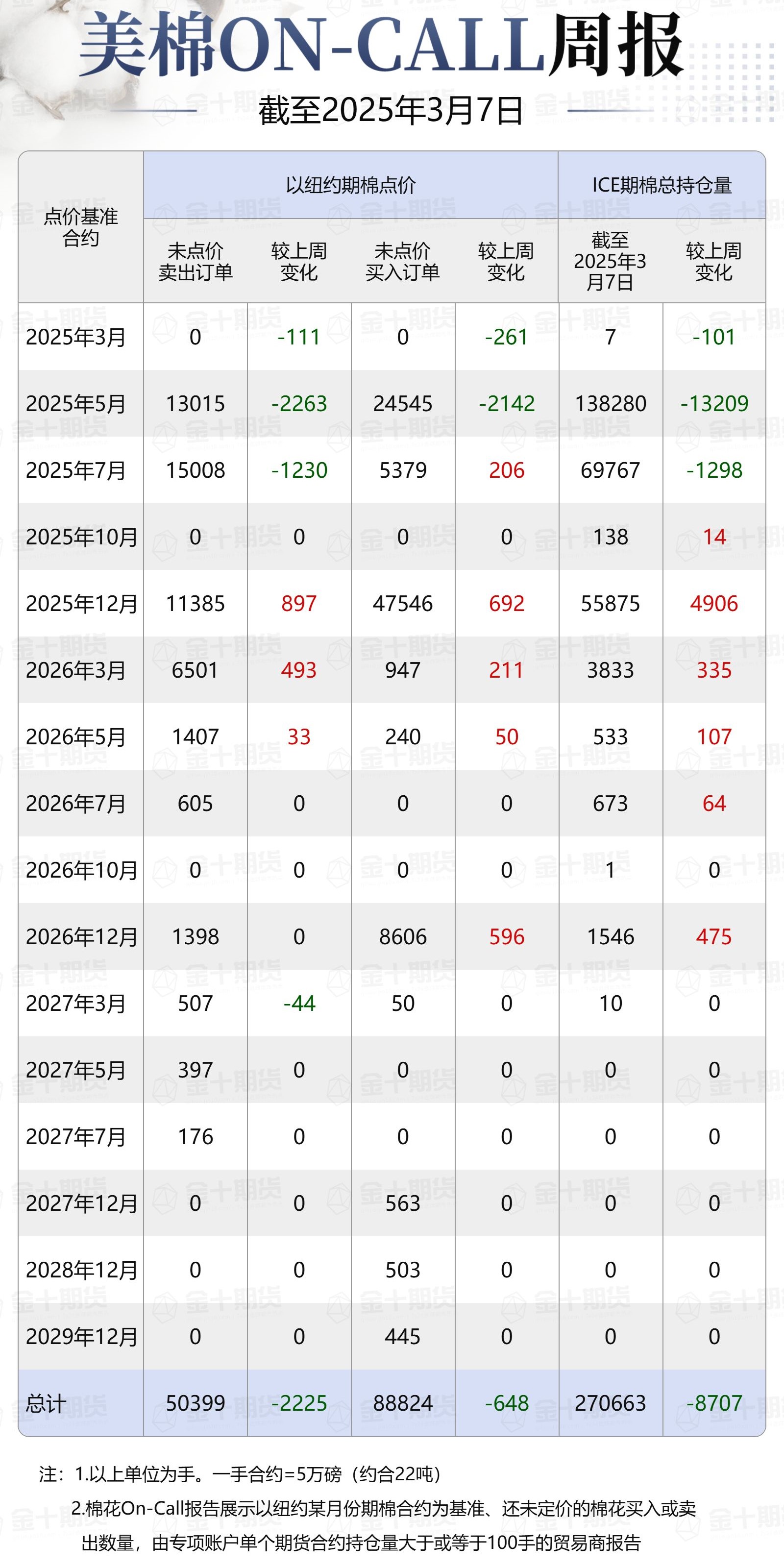 據(jù)美國商品期貨交易委員會(CFTC)最新數(shù)據(jù),截至3月7日,①美棉On-Call未點價賣出訂單50399手,環(huán)比減少2225手;未點價買入訂單88824手,環(huán)比減少648手;②ICE期棉2503合約上賣方未點價合約為0手,環(huán)比減少111手;③ICE期棉2505合約上賣方未點價合約為13015手,環(huán)比減少2263手;④ICE期棉2507合約上賣方未點價合約為15008手,環(huán)比減少1230手;⑤ICE棉花期貨盤面2024/25年度(8月至次年7月)的On-Call合約未點價賣出訂單為28023手,環(huán)比減少3604手。