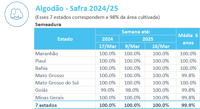據(jù)巴西農(nóng)業(yè)部下屬的國(guó)家商品供應(yīng)公司CONAB,截至3月16日,巴西棉花播種率為100.0%,上周為100.0%,去年同期為100.0%。
