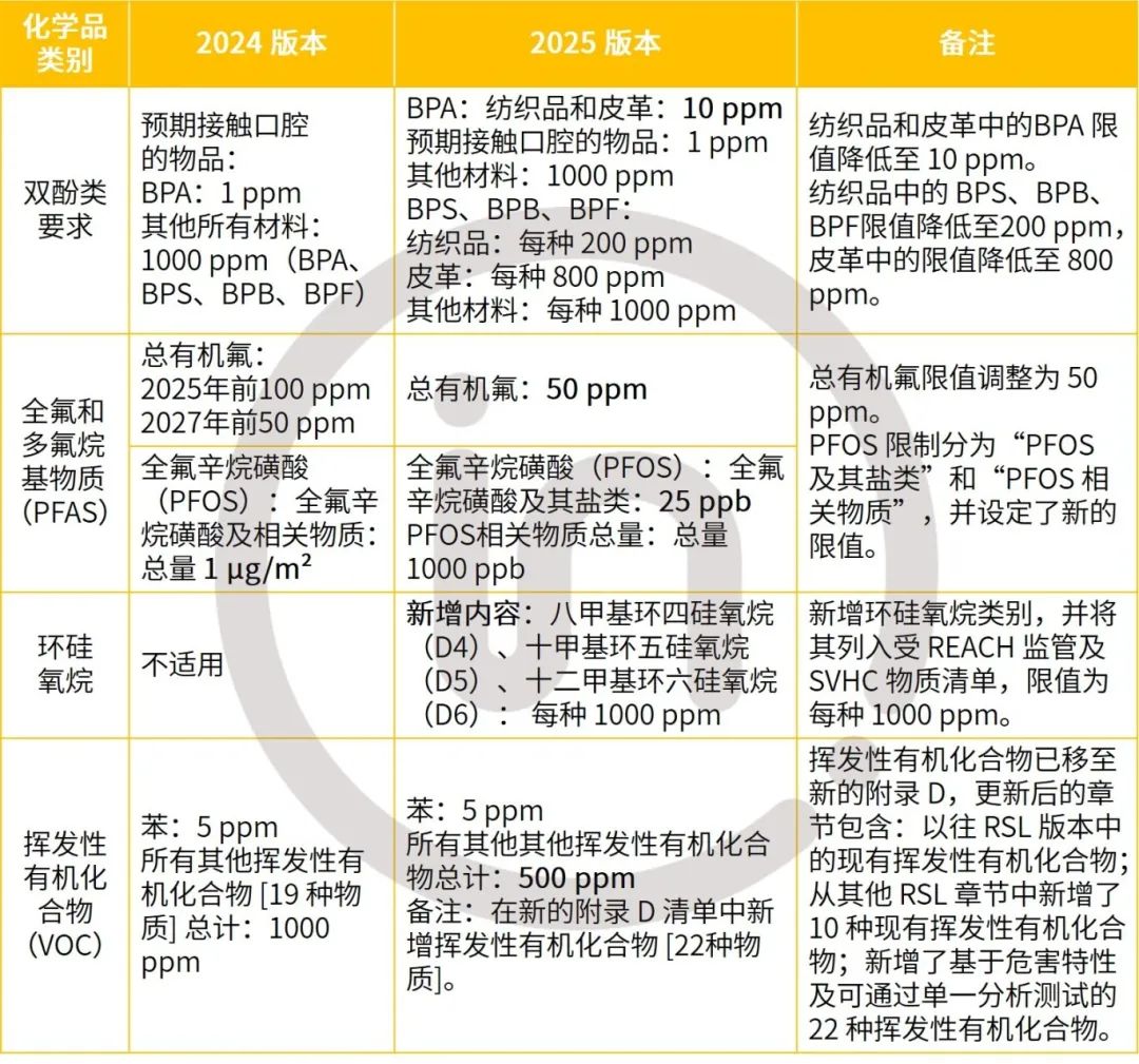 以下是雙酚類、全氟和多氟烷基物質(zhì)、環(huán)硅氧烷及揮發(fā)性有機(jī)化合物的關(guān)鍵變更對比