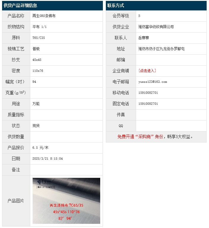3月21日,濰坊富華紡織有限公司再生GRS滌棉平布T65/C35 45x45 110x76 94" 1/1,報價為6.5元/米,實(shí)際成交價以協(xié)商為準(zhǔn)。[點(diǎn)擊查看詳情]
