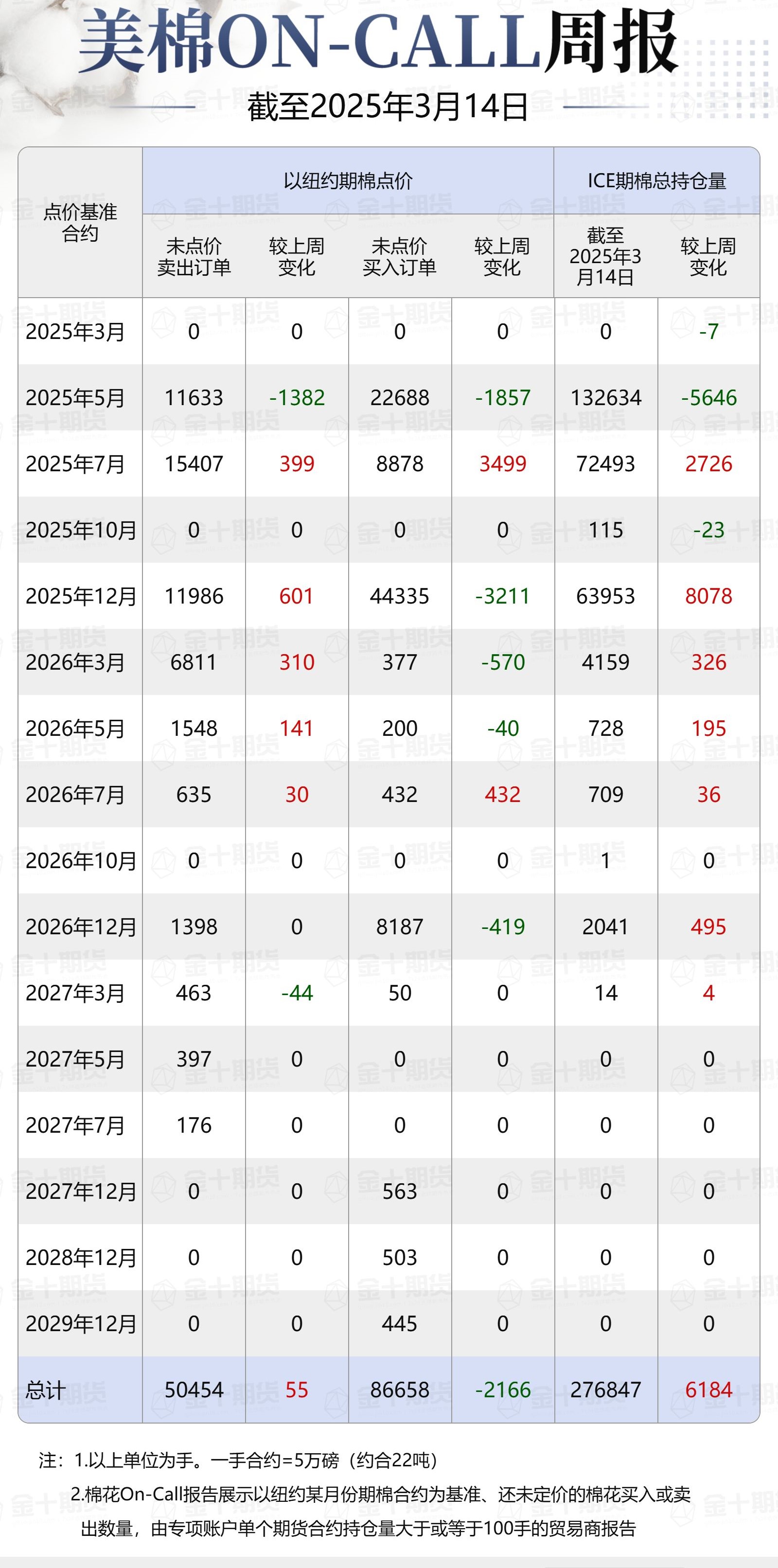 據(jù)美國(guó)商品期貨交易委員會(huì)(CFTC)最新數(shù)據(jù),截至3月14日,①美棉On-Call未點(diǎn)價(jià)賣出訂單50454手,環(huán)比增加55手;未點(diǎn)價(jià)買入訂單86658手,環(huán)比減少2166手;②ICE期棉2503合約上賣方未點(diǎn)價(jià)合約為0手,環(huán)比增加0手;③ICE期棉2505合約上賣方未點(diǎn)價(jià)合約為11633手,環(huán)比減少1382手;④ICE期棉2507合約上賣方未點(diǎn)價(jià)合約為15407手,環(huán)比增加399手;⑤ICE棉花期貨盤面2024/25年度(8月至次年7月)的On-Call合約未點(diǎn)價(jià)賣出訂單為27040手,環(huán)比減少983手。
