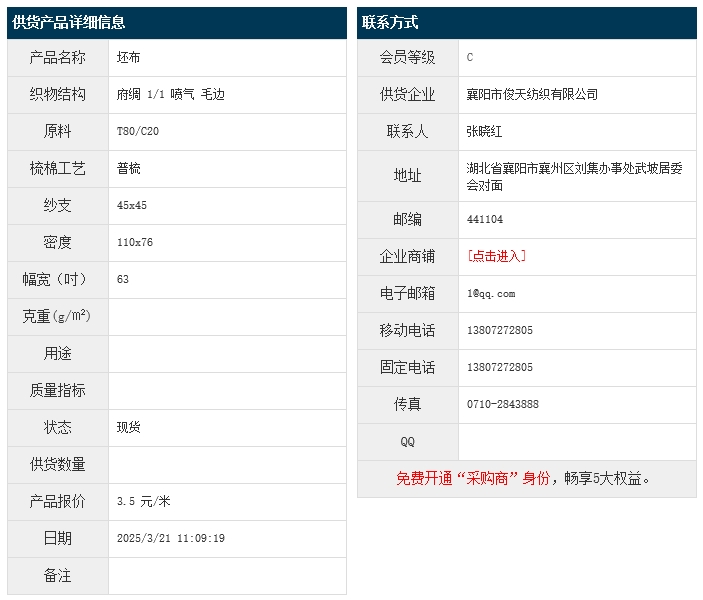 3月21日,襄陽俊天紡織有限公司滌棉府綢T80/C20 45x45 110x76 63" 1/1 噴氣 毛邊,報價為3.5元/米,實際成交價以協(xié)商為準(zhǔn)。[點擊查看詳情]