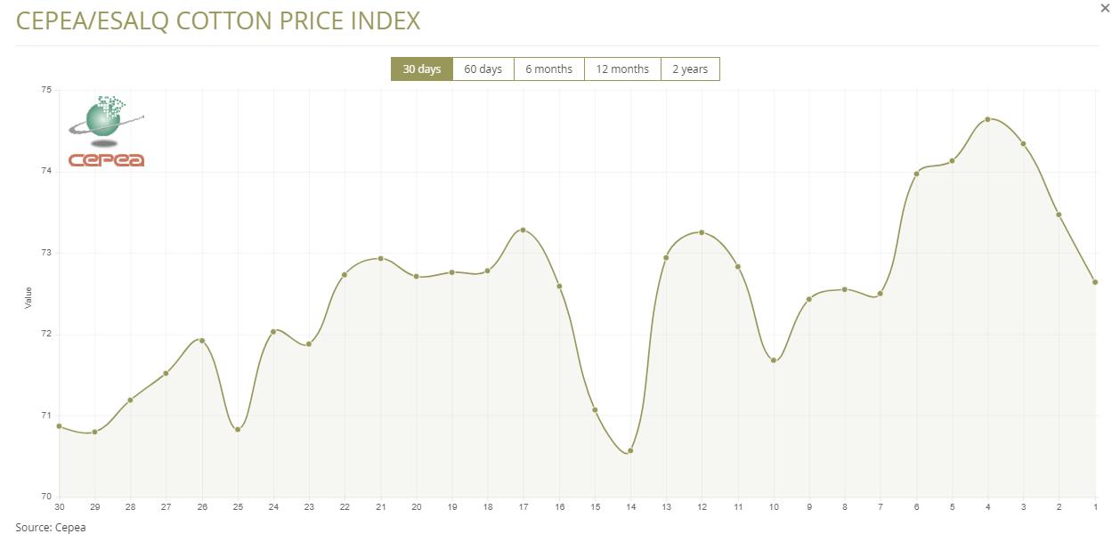 2025年3月21日,巴西CEPEA/ESALQ棉花價(jià)格指數(shù)報(bào)72.64美分/磅,較前一交易日下滑1.13%,該指數(shù)較前月同期增長(zhǎng)2.93%。