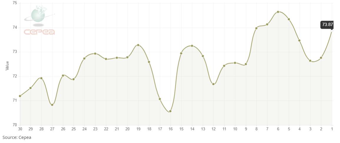 3月25日(周二),巴西CEPEA/ESALQ棉花價(jià)格指數(shù)報(bào)73.87美分/磅,較前一交易日上漲1.53%,該指數(shù)較前月同期增長4.68%。