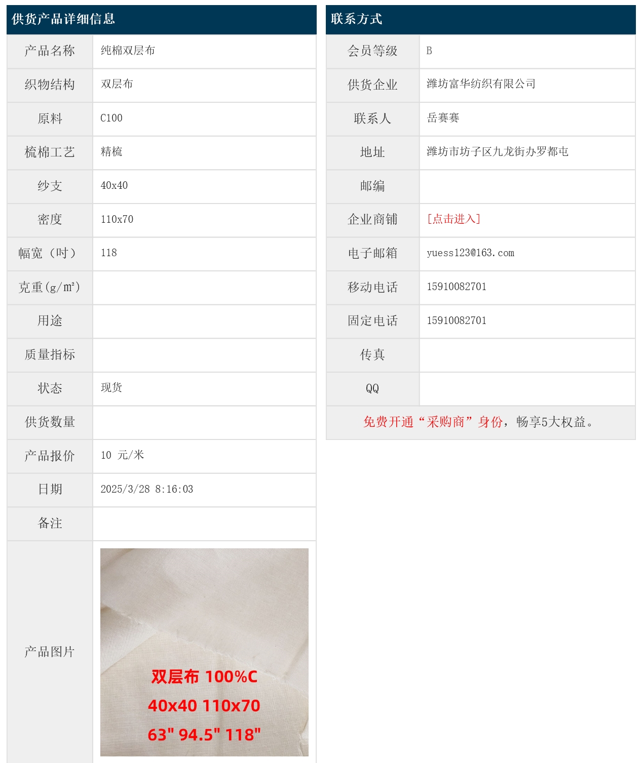 3月28日,濰坊富華紡織有限公司純棉雙層布JC100 40x40 110x70 118",報價為10元/米,實際成交價以協(xié)商為準。[點擊查看詳情]