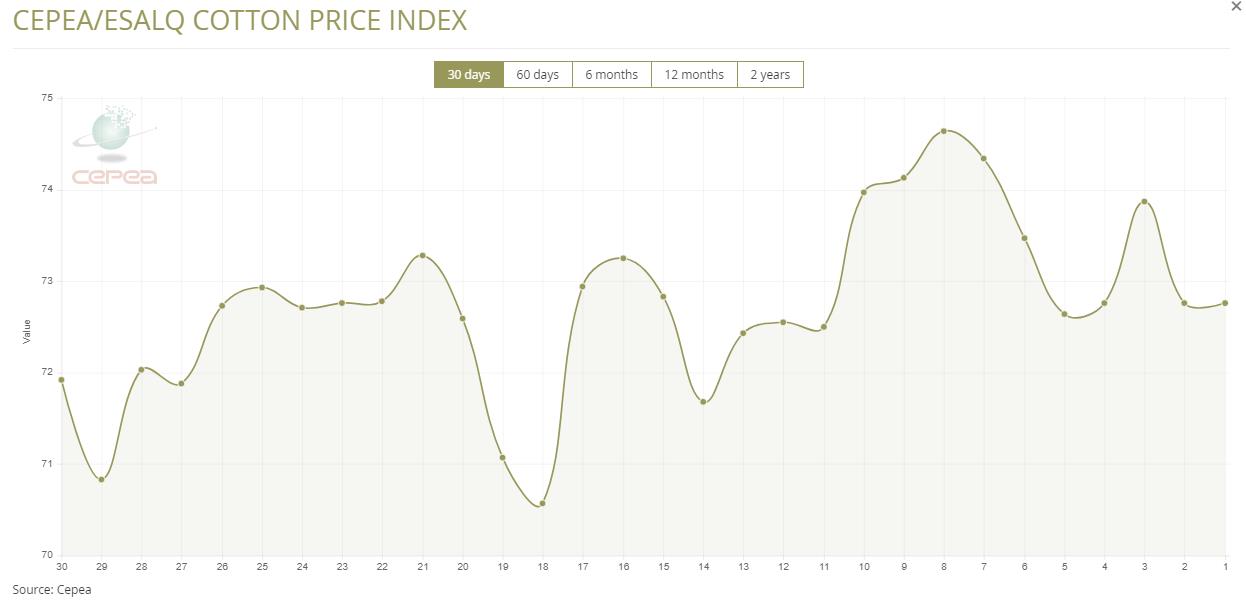 3月27日(周四),巴西CEPEA/ESALQ棉花價格指數(shù)報72.76美分/磅,較前一交易日持平,該指數(shù)較前月同期增長3.1%。