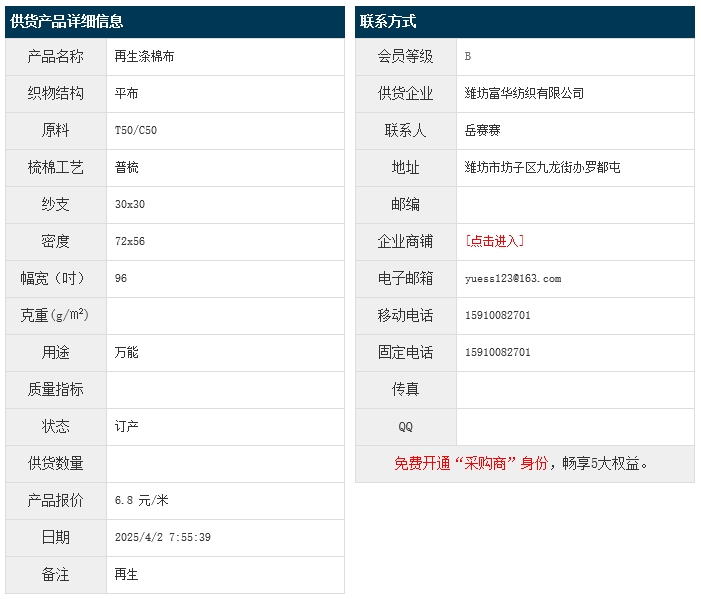 4月2日,濰坊富華紡織有限公司再生滌棉平布T50/C50 30x30 72x56 96",報(bào)價(jià)為6.8元/米,實(shí)際成交價(jià)以協(xié)商為準(zhǔn)。[點(diǎn)擊查看詳情]