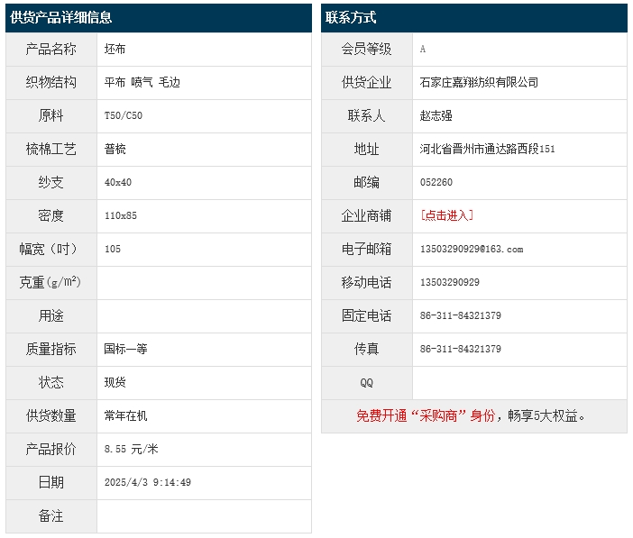4月3日,石家莊嘉翔紡織有限公司滌棉平布T50/C50 40x40 110x85 105" 噴氣 毛邊,報價為8.55元/米,實(shí)際成交價以協(xié)商為準(zhǔn)。[點(diǎn)擊查看詳情]