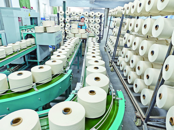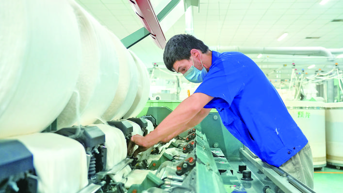 4月1日,工人在新疆精一紡織科技有限責(zé)任公司紡織車間作業(yè)。