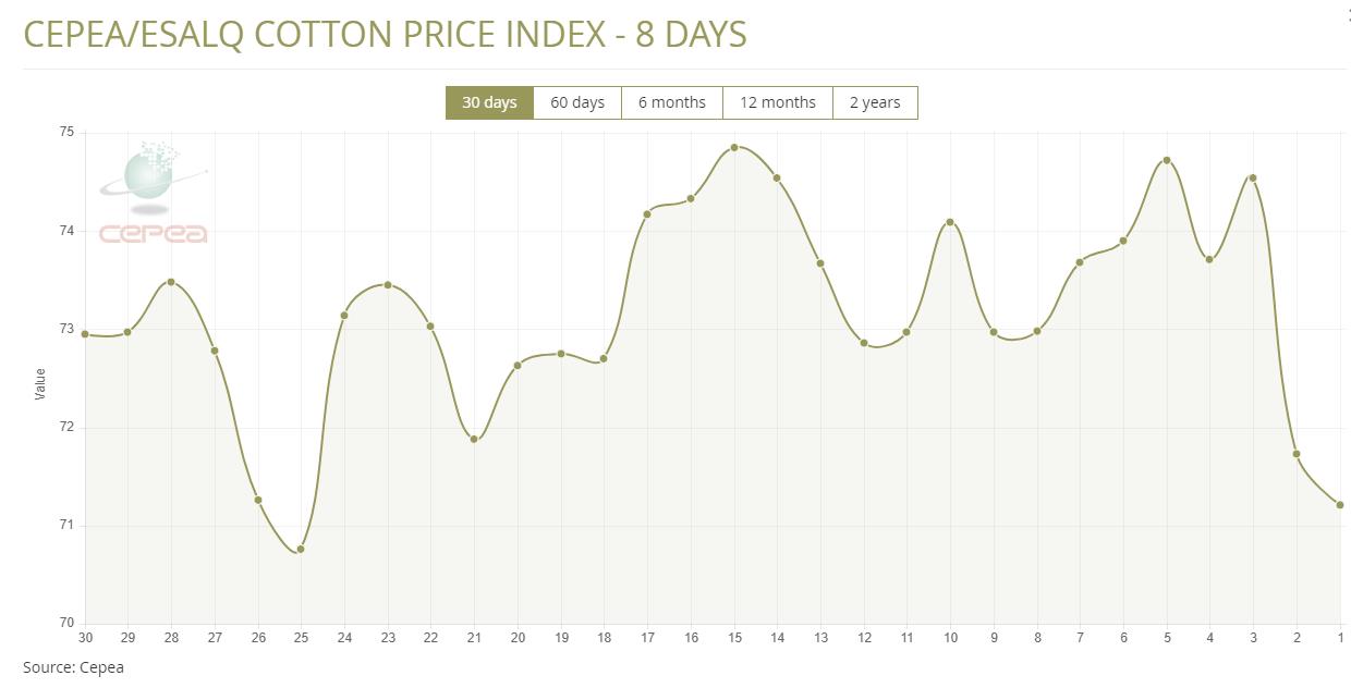4月7日(周一),巴西CEPEA/ESALQ棉花價格指數(shù)報71.21美分/磅,較前一交易日下跌0.72%,該指數(shù)較前月同期下跌3.64%。