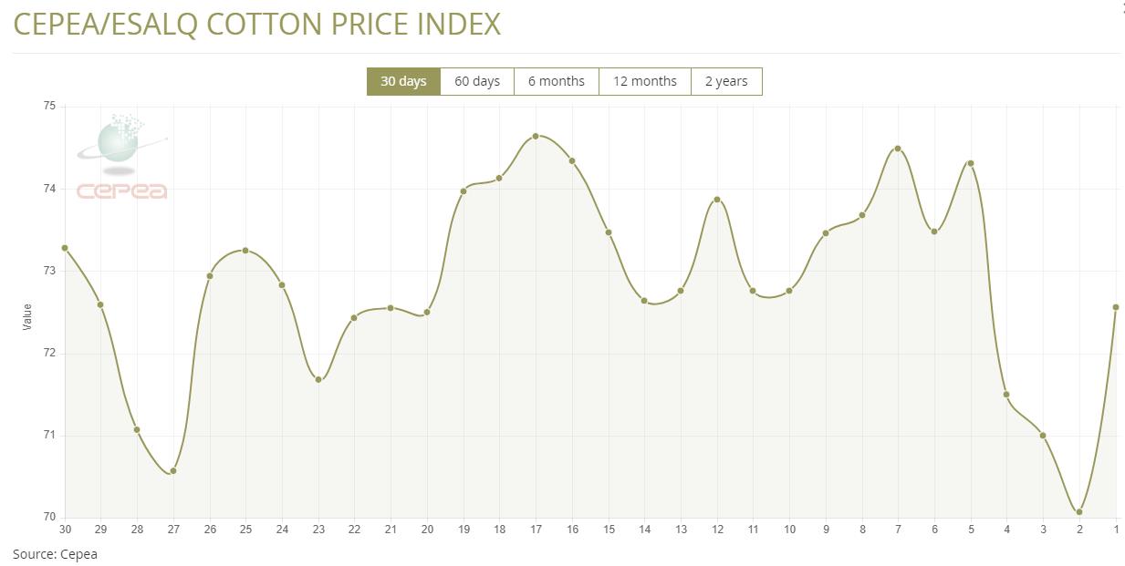 4月9日(周三),巴西CEPEA/ESALQ棉花價格指數(shù)報(bào)72.56美分/磅,較前一交易日上漲3.55%,該指數(shù)較前月同期下跌1.52%。