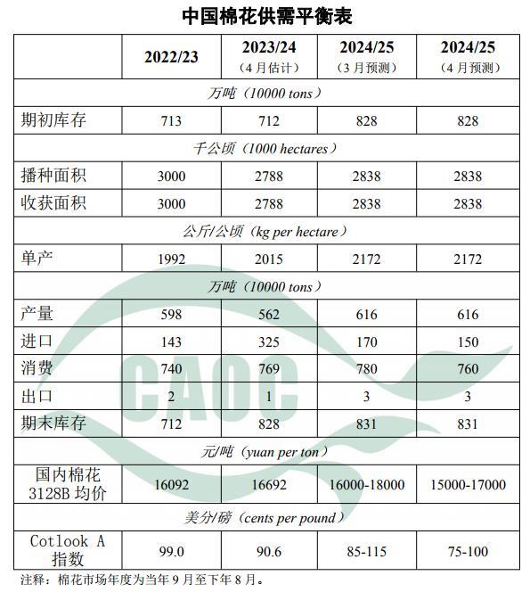 本月對2024/25年度棉花生產(chǎn)情況不作調(diào)整。受美方對我國出口商品加征關(guān)稅影響,中國紡織品服裝出口趨緩,消費量下調(diào)20萬噸至760萬噸,進口量下調(diào)20萬噸至150萬噸。近期新疆大部分地區(qū)氣溫偏高,總體利于棉花播種。