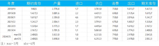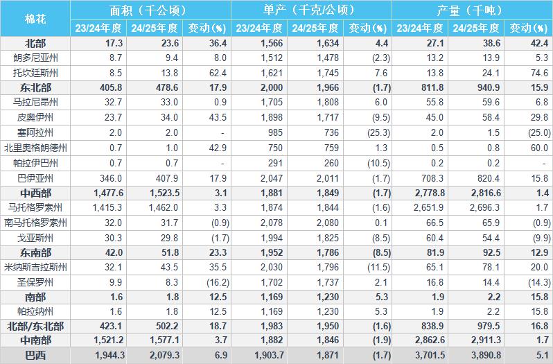 2024/25年度巴西棉花種植面積預(yù)估為207.93萬公頃,同比增加6.9%,2023/24年度為194.43萬公頃。